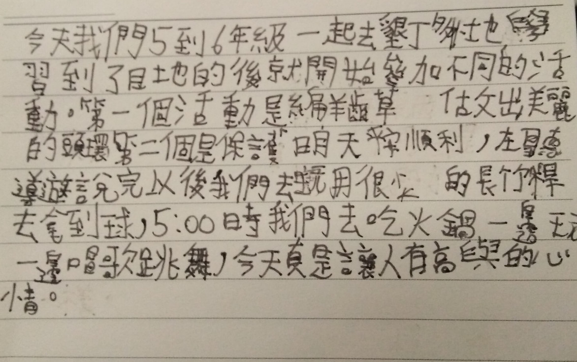 今天我們小實光G6再一次(誒?)出發去小旅行了~~~~~ 這次我們要去的地方是牡丹,所以要先搭高鐵去左營,再轉車去枋寮車站,最後才能去到山上。 但是到枋寮車站時已經中午了(OAO) 所以我們先去吃午餐(自助餐) 等到吃完午餐後我們就上山了,到達山上後我們先去做了花環(頭飾)先割草後再把草綁成一束,之後像編辮子一樣把草編好,最後再綁起來就可以了٩(˃̶͈̀௰˂̶͈́)و 之後再去一個類似寺廟的地方,老師說這裡是要「敬山神」(祖靈)的地方,而旁邊的小廟裡住著祖靈,所以要很有禮貌。 接著導覽老師給我們發了一個文件,並且開始解釋文件的故事(內容) 。等到講完故事後⋯⋯⋯⋯就下雨了! 因此我們大家就搭車到了我們住的「頭目的家」 。主人(?)阿龍老師很好心的幫我們介紹了民宿1樓的展示物品(我們住2樓)像是有一個只有排灣族女頭目的女兒出嫁時要用的扇子(要讓女方的家人背著要出嫁的女兒 女兒拿扇子遮住臉) 還有一個用真的雄鷹(!)的頭和爪子加上雲豹的皮和很多珍珠的帽子(也不完全算帽子,比較像是帶在頭上的環)上面還有紅色的線,原本我不知道是什麼,一問之下才發現那是之前在荷蘭統治時期時,荷蘭人跟原住民(排灣族)爭戰時,荷蘭人被殺之後原住民把荷蘭人的頭髮剪下來之後拿去放在飾品上(感覺好恐怖啊啊OAO) 接著我們一起去玩刺球,因為竿子很重+第一次玩,所以我們都沒刺到,不過⋯⋯⋯ 刺到一半突然下雨啦!!!!!!! QWQ 所以我們只好邊淋雨邊玩了⋯⋯⋯⋯(QQ) 等到都玩好後,我們搭車前往吃晚餐的地方 晚餐我們吃火鍋,不吃辣的吃南瓜火鍋,吃辣的則是吃泡菜火鍋 我吃的是南瓜火鍋,裡面有很多的料,像是蛋餃,高麗菜,木耳,番茄,玉米等等 等到大家都吃完後那裡的長輩們就教我們唱歌和跳舞,後來我們就搭車回 「頭目的家」~~